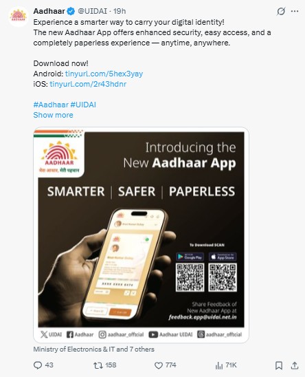 नवीन ॲप ‘Aadhaar’ या नावाने प्ले स्टोअर (Play Store) आणि ॲप स्टोअरवर (App Store) उपलब्ध आहे. युजर्स आधार क्रमांक आणि ओटीपी वापरून यावर नोंदणी करू शकतात. UIDAI च्या म्हणण्यानुसार, हे नवीन ॲप ‘डिजिटल इंडिया’ उपक्रमाला बळकट करणारे असून, आधार डेटाची गोपनीयता आणखी मजबूत करेल. जुन्या ॲपमधील फक्त डाउनलोड आणि शेअरिंगच्या मर्यादेऐवजी, नवीन ॲप पूर्णपणे सुरक्षित आणि अत्याधुनिक तंत्रज्ञानावर आधारित आहे.