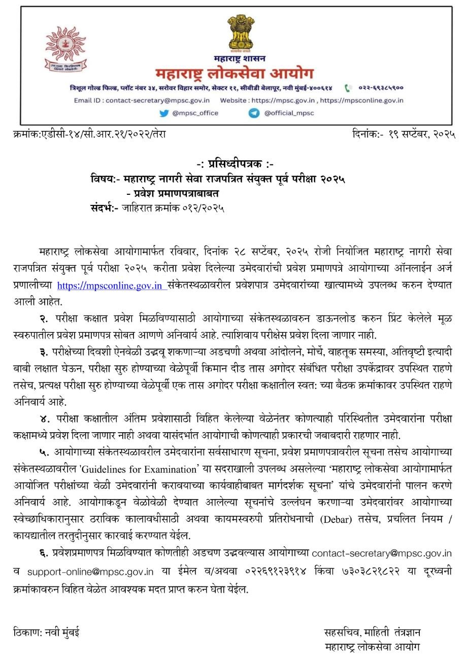 परीक्षा कक्षात प्रवेश मिळविण्यासाठी आयोगाच्या संकेतस्थळावरुन डाऊनलोड करुन प्रिंट केलेले मूळ स्वरुपातील प्रवेश प्रमाणपत्र सोबत आणणे अनिवार्य आहे. त्याशिवाय परीक्षेस प्रवेश दिला जाणार नाही. प्रस्तुत परीक्षा यापूर्वी रविवार, दिनांक २८ सप्टेंबर, २०२५ रोजी घेण्याचे नियोजित होते व त्याकरीता उमेदवारांना प्रवेश प्रमाणपत्रे वितरित करण्यात आलेली होती. सदर जुन्या प्रवेश प्रमाणपत्राच्या आधारे उमेदवारांना प्रस्तुत दिनांक ९ नोव्हेंबर, २०२५ रोजीच्या परीक्षेकरीता प्रवेश दिला जाणार नाही. उमेदवारांनी नव्याने उपलब्ध करुन देण्यात आलेले व परीक्षेचा दिनांक ९ नोव्हेंबर, २०२५ नमूद असलेले प्रवेश प्रमाणपत्र परीक्षेच्या वेळी सोबत आणणे अनिवार्य आहे. अन्यथा विषयांकित परीक्षेकरीता प्रवेश नाकारला जाईल व याबाबतची संपूर्ण जबाबदारी संबंधित उमेदवाराची राहील.