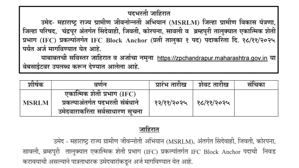 अर्ज सादर करण्याची अंतिम तारीख 19 नोव्हेंबर 2025 असून, त्यानंतर आलेले अर्ज स्वीकारले जाणार नाहीत. या भरतीद्वारे ग्रामीण भागातील विविध प्रकल्प आणि उपक्रमांमध्ये कार्य करण्याची संधी उपलब्ध होणार आहे. अधिक माहिती, पात्रता, अटी व अर्ज नमुना अधिकृत जाहिरातीत उपलब्ध आहेत. इच्छुक उमेदवारांनी वेळेत अर्ज करून या संधीचा फायदा घ्यावा.